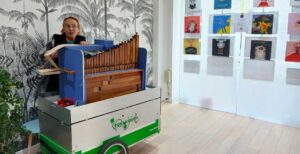 Claire Loupiac derrière son orgue de barbarie fait maison.