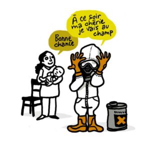 Ayant toujours vécu en milieu urbain en banlieue, Claire est passionnée par les questions touchant à l’écologie. « Cela fait 15 ans que je creuse ces questions avec de nombreuses associations. » C’est avec la FADEAR (Fédération association pour le développement de l’emploi agricole et rural), un réseau réparti sur toute la France, réunissant des paysans désireux de proposer un modèle agricole permettant de vivre décemment de leur travail, qu’elle pose un premier jalon dans cet univers. D’autant plus facile pour elle que le siège de cette association se trouve à Bagnolet et partage ses locaux avec la Confédération paysanne. Elle réalise deux bandes dessinées sur l’alimentation et l’agriculture et les enjeux écologiques qui en découlent. « Nous nous sommes tout de suite accordés, d’autant plus que je travaillais la question des pesticides et celle du climat. »