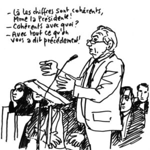 En 2019, SUD-Solidaires initie une démarche éditoriale en invitant plusieurs dizaines de personnalités (écrivains, psychanalyste, inspecteur du travail, artiste, syndicalistes…) à suivre le procès en appel des deux ex-dirigeants de France Télécom, condamnés en première instance pour harcèlement suite à la vague de suicides qui a eu lieu dans l’entreprise. Chacune de ces personnalités devait rédiger un récit d’audience, tandis que Claire Robert réalisait chaque jour des croquis. « C’est une expérience inoubliable, se rappelle la dessinatrice. Je ne devais assister qu’à la première audience, mais, j’ai été tellement prise et secouée, que j’y suis retournée le lendemain et le surlendemain. J’ai essayé de me rendre à toutes les audiences, mais ce n’était pas toujours possible… Trois mois de procès ! » Armée de ses feutres et de ses feuilles de papier, elle réalise ses croquis à vif, chope au vol des phrases d’avocat, la plupart des ténors du barreau, pour une fois chez elle, les scanner et les envoyer pour être mis en ligne. L’ensemble a donné lieu à un ouvrage « La Raison des plus forts. Chroniques du procès France Télécom », édité à l’Atelier.