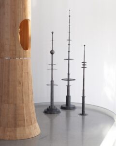 Celle qui fréquente beaucoup la bibliothèque de l’INHA (Institut National de l’histoire de l’art) rue de Richelieu à Paris, élabore ses pièces dans son atelier à Poush à Aubervilliers : « les gens qui travaillent avec moi, mes fournisseurs en acier sont pour la plupart aussi en Seine-Saint-Denis. J’ai plusieurs adresses où je vais pour différents matériaux ». L’une de ses œuvres justement resssemble à une tour emblématique de Seine-Saint-Denis : la Tour de Romainville, avec sa silhouette rétro futuriste. Clara Imbert aime imaginer ses œuvres « de façon monumentale. J’aime bien aussi dialoguer avec l’architecture. Les grandes œuvres permettent aussi de se projeter, d’approcher l’œuvre différemment »