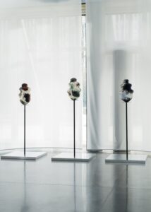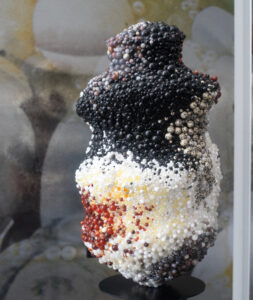 Réalisés dans un premier temps en terre, ces Tako-Tsubo ont été ensuite déformés en suivant les radios de gens ayant vécu ce syndrome (Ndr l’artiste collectionne depuis dix ans les radios de personnes ayant fait un Tako-Tsubo). Ils ont été scannés puis imprimés en 3D et finalement recouverts d’une peau où des perles en pierre naturelles ont été collées : « Au Japon, la jade, le quartz ont des vertus bienfaitrice pour le corps. Nous avons créé une nappe émotionnelle autour de ces formes. Toutes les perles étaient collées à la main. On a créé une espèce de sertissage avec des microperles entre les perles. Il y a comme l’idée de genèse, d’œufs de poisson. »