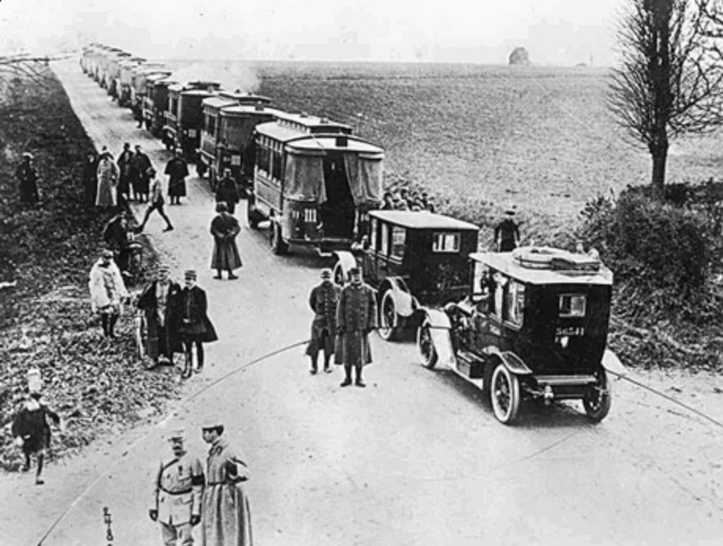 Alors que le gouvernement est déjà parti vers Bordeaux, que les Allemands sont à 50 km, le général Gallieni, gouverneur militaire de Paris, a décidé de réagir. Prévenu par une reconnaissance aérienne partie du Bourget, il sait que le général Von Klück vient de s’éloigner du reste des troupes du Kaiser. Son armée ne marche plus vers le sud, elle veut contourner l’armée française vers l’est, la prendre en nasse. C’est l’occasion à ne pas manquer de couper la ligne de front. Mais comment réagir suffisamment vite ? Toutes les forces doivent être remployées, mais certains régiments sont trop loin et la plupart des véhicules ont déjà été réquisitionnés. restent les taxis. ces véhicules peuvent transporter cinq personnes chacun en plus du chauffeur. A 20h, le général Clergie, chef d’état-majeur prescrit de rassembler toutes les voitures Renault disponibles pour transporter les six mille hommes de la brigade du général Félineau. L’organisation est confiée au lieutenant Lefas. Dans son rapport, celui-ci écrit : « A onze heures, Monsieur le Gouverneur militaire de Paris a fait demander si nous pouvions lui procurer douze cents taxis-auto, partant de Paris à minuit et demie, rendus à deux heures du matin place de la mairie à Tremblay-lès-Gonesse. » Rapidement, cinq cents sont réunis sur l’esplanade des Invalides. Un premier convoi de cent cinquante taxis roule vers la Villette, suivi de quatre cents autres qui s’engagent sur la route du Bourget, débouchant dans la nuit sur la Plaine Saint-Denis, d’autres filent vers Gagny. La confusion règne, les embouteillages, les accrochages sont nombreux, d’autant plus que l’on roule lanternes éteintes. Chez les chauffeurs c’est l’incertitude, va-t-on rapatrier des blessés ou bien amener des troupes au front ? Et le compteur, on le laisse tourner le compteur ?