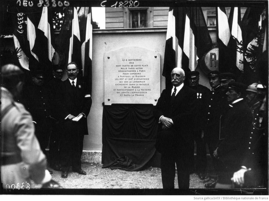 Gagny – anniversaire de la bataille de la Marne – Inauguration de la plaque commémorative du départ des taxis de la Marne devant l’Hôtel de Ville – btv1b9034344k.jpg © Agence Meurisse / Gallica