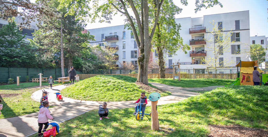 Les crèches départementales voient progressivement leur cours se transformer en véritable jardin pour le plus grand plaisir des tout-petits. Comme ici à la crèche Betty Williams à La Courneuve.