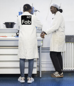 C’est le cas d’Ella Tsondé qui souhaite lancer Dolizi à l’automne. C’est là, dans le laboratoire de Diogou, qu’elles ajustent la formule de son exfoliant doux. Toutes deux abordent très vite les questions de PH, de stabilité de la couleur, du choix du parfum, de sensation de confort. Diogou Dramé sort des mini-flacons pour choisir le parfum idéal. « Je ne veux pas de senteurs florales ni que ça sente le gazon » explique Ella. La short-list s’arrête sur : « fleur de coton », « bois fleuri ambré », « hibiscus » pour l’exfoliant. Sa gamme de produits cosmétiques cible l’hyperpigmentation des peaux noires. « Est-ce que tes produits s’adressent aussi aux femmes enceintes, aux femmes allaitantes ? Car si c’est le cas, le toxicologue va nous dire si on est dans les bonnes marges de sécurité. » Ici, penser une crème, un soin, signifie penser en amont aux personnes à qui il s’adresse, où il sera vendu et combien il rapportera. Les cosmétiques, un secteur où les femmes sont nombreuses à entreprendre en Seine-Saint-Denis.