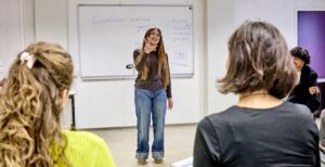 Sauf que l’art du discours, ce n’est pas qu’un texte : il est aussi incarné. Pour cela, voyage dans la salle d’à côté où Laetitia Hipp, comédienne, transmet les bases de l’expression scénique. Mise en voix d’un texte, improvisations, posture, débit, déplacements dans l’espace : avec cette professionnelle de l’art oratoire, les aspirants au concours – dont la finale aura lieu le 2 mai prochain après 6 tours de sélection préalables – sauront à la perfection vivre ce qu’il·elles disent.