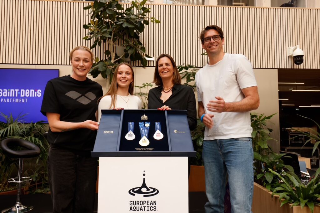 Laure Manaudou, Camille Lacourt, la triple championne olympique suédoise Sarah Sjöström, il y avait de beaux poissons, au siège du Département, pour l’annonce du J-100 des championnats d’Europe de natation à Saint-Denis. Le Centre aquatique olympique de Saint-Denis, construit à l’occasion des Jeux olympiques de Paris 2024, va en effet accueillir, du 31 juillet au 16 août prochain, les meilleur·es athlètes en natation, plongeon et natation synchronisée d’Europe. La billetterie est déjà ouverte, et les courses où s’alignera le prodige Léon Marchand, phénomène des derniers Jeux, sont déjà quasi toutes complètes. Un événement auquel le Département souhaite aussi faire participer les habitant·es de Seine-Saint-Denis, lui qui offrira à cette occasion 1 500 billets aux nageurs en herbe du territoire, qu’ils soient en clubs ou accueillis dans les dispositifs d’apprentissage estivaux, mais aussi à des jeunes de l’Ase.