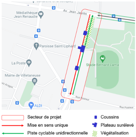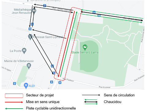 - Mise en sens unique dans le sens nord – sud. La circulation se fera depuis l’avenue Jaurès vers le giratoire au niveau de la rue Pasteur ;
