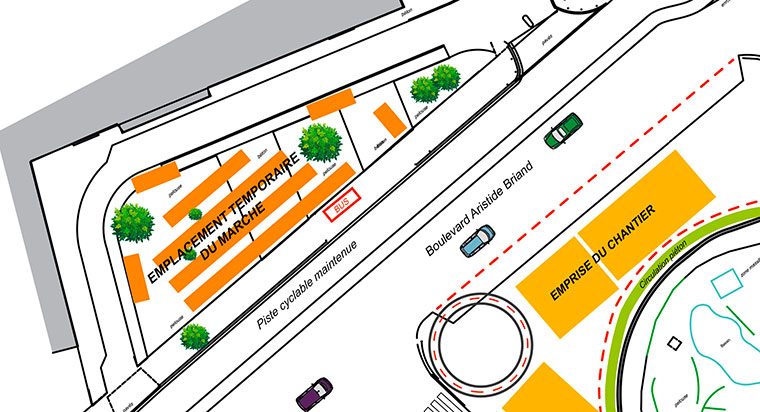 Photo : plans des emprises du chantier et de l’emplacement temporaire du marché