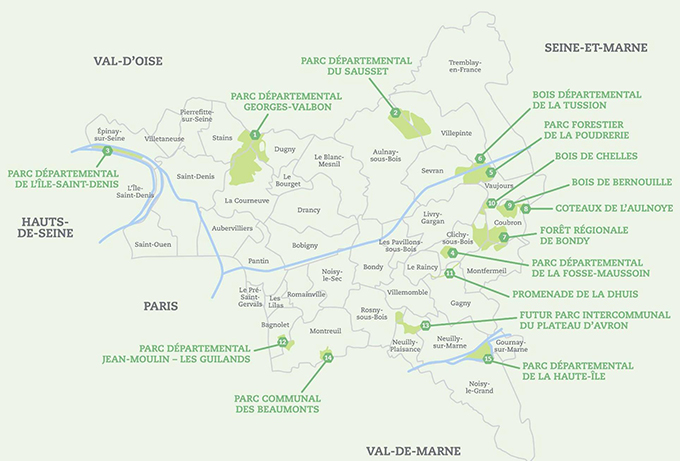– le Conseil départemental de la Seine-Saint-Denis (aussi structure animatrice du site) : parc Georges-Valbon, parc du Sausset, parc de l’Ile-Saint-Denis, parc de la Fosse Maussoin, parc Jean-Moulin - Les Guilands, parc de la Haute-Ile, parc forestier de la Poudrerie, et du bois de la Tussion,